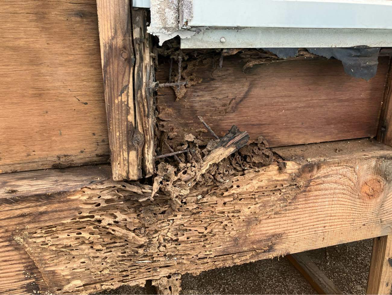 長年の雨水の侵入により、内部の木材が腐食し、シロアリの被害も進行していたのです。もしこのまま上から塗装していたら…と考えるとゾッとします。