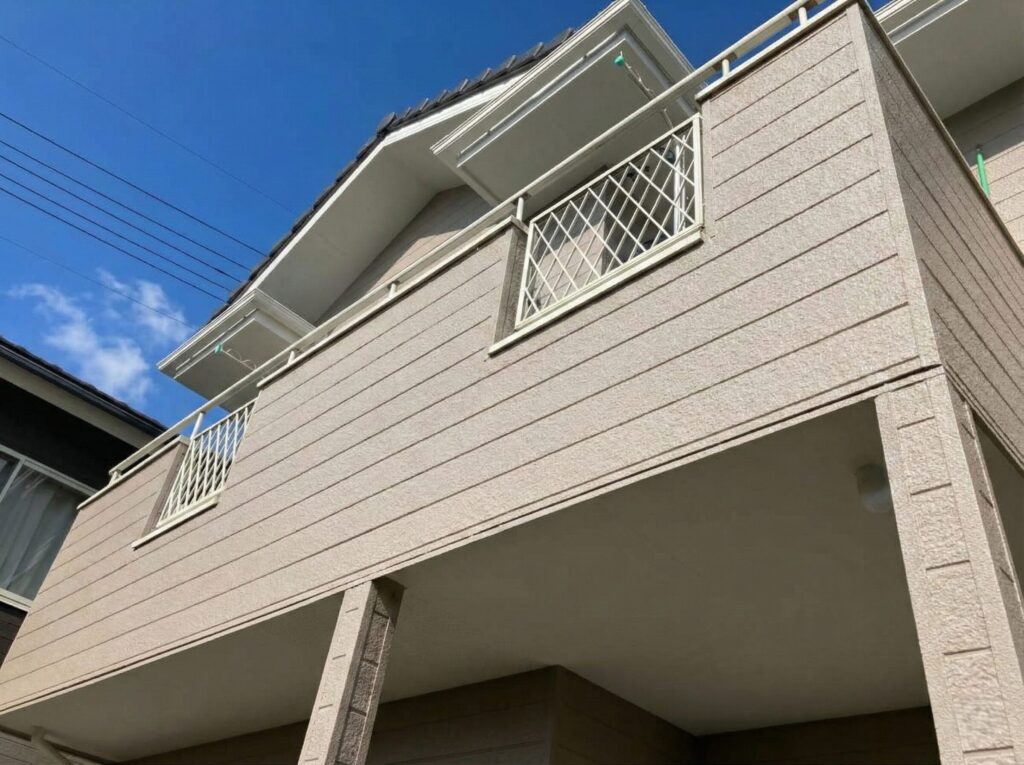 落ち着いたベージュのサイディングが、鮮やかな青空に美しく映えます。