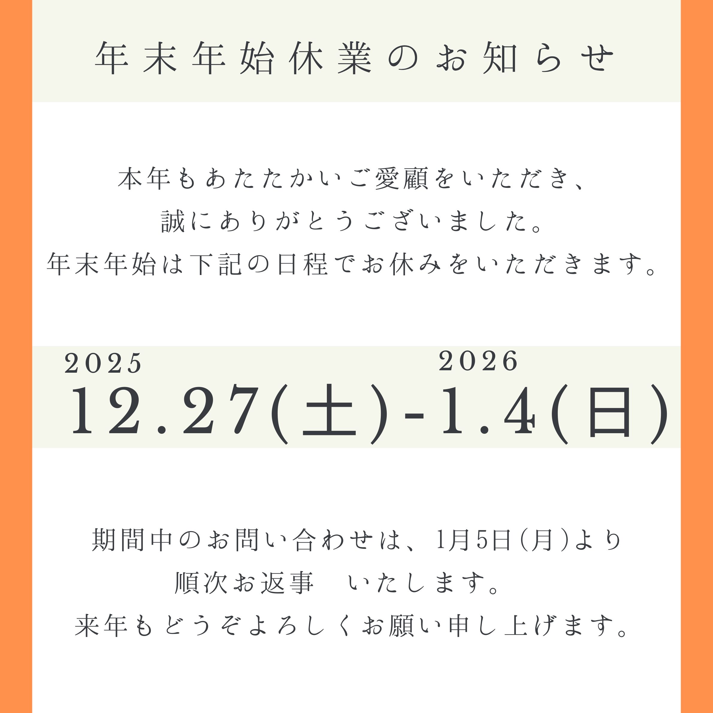 年末年始休業のお知らせ